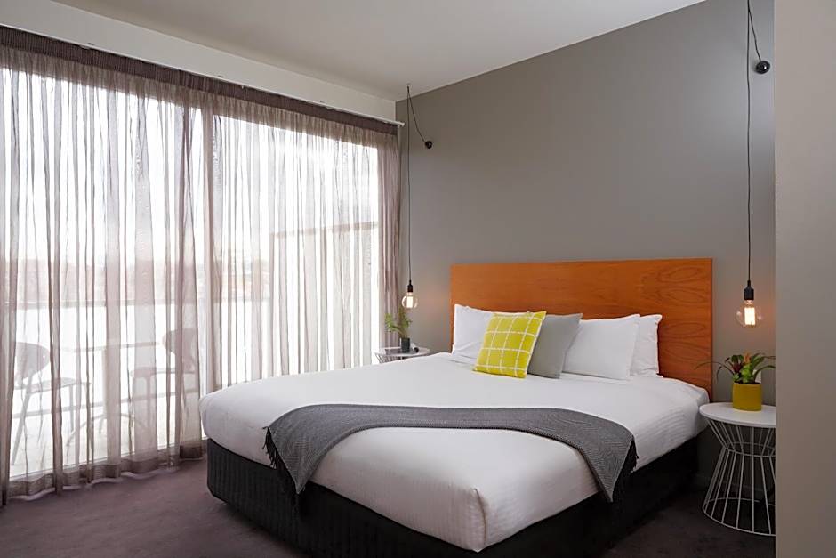 The spacious room offers a view of Melbourne's famous tram line and includes a queen-size bed, walk-in shower, and study desk.